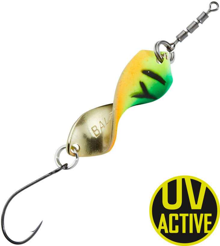 Ober- und Unterseite jedes Spoons haben Kontrastfarben, die beim Drehen ein einzigartiges Farbspiel ergeben. Jeder Spoon ist mit einem Micro-Dreifachwirbel ausgestattet, der Schnurdrall sicher verhindert. Lässt sich sehr weit werfen.